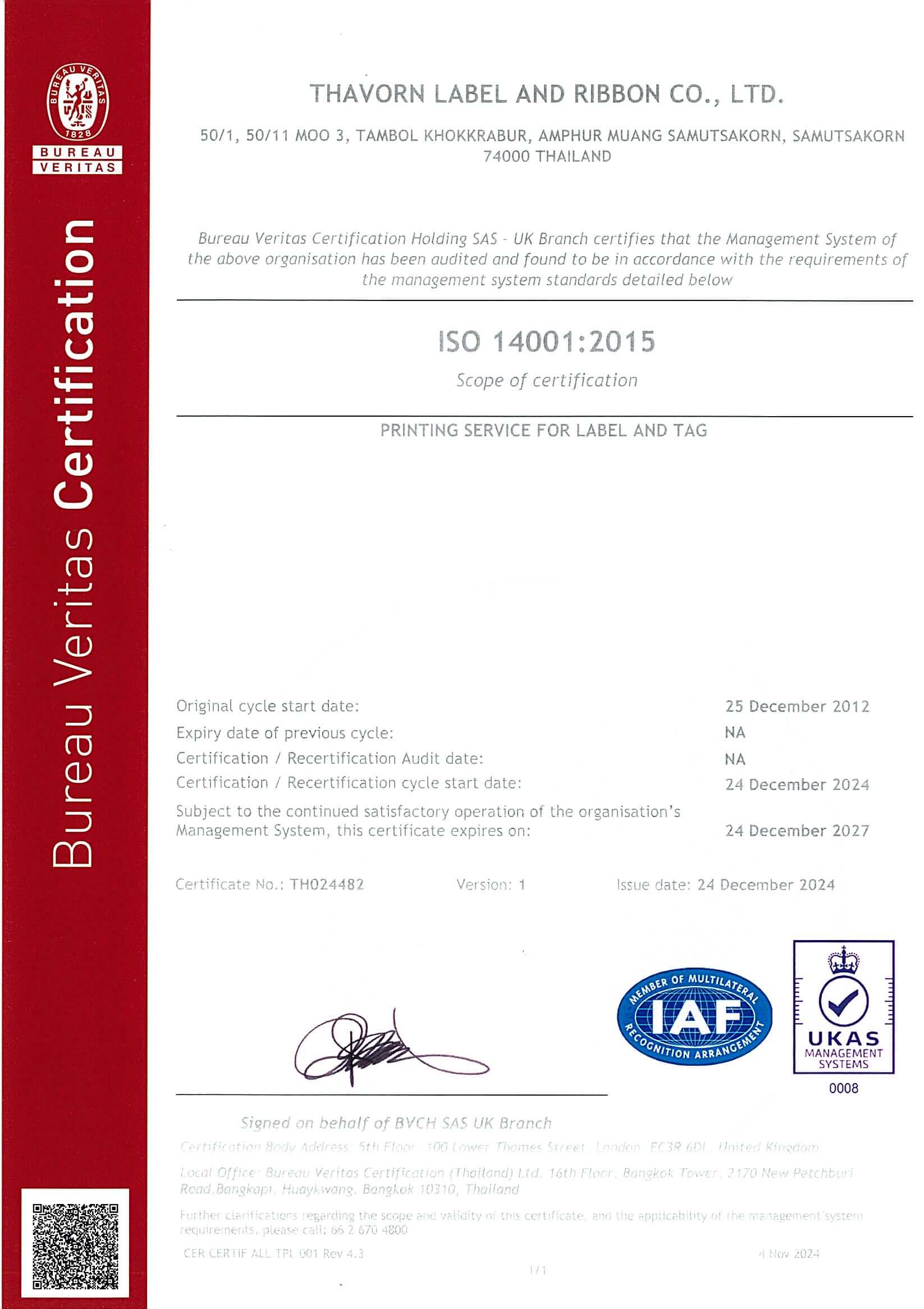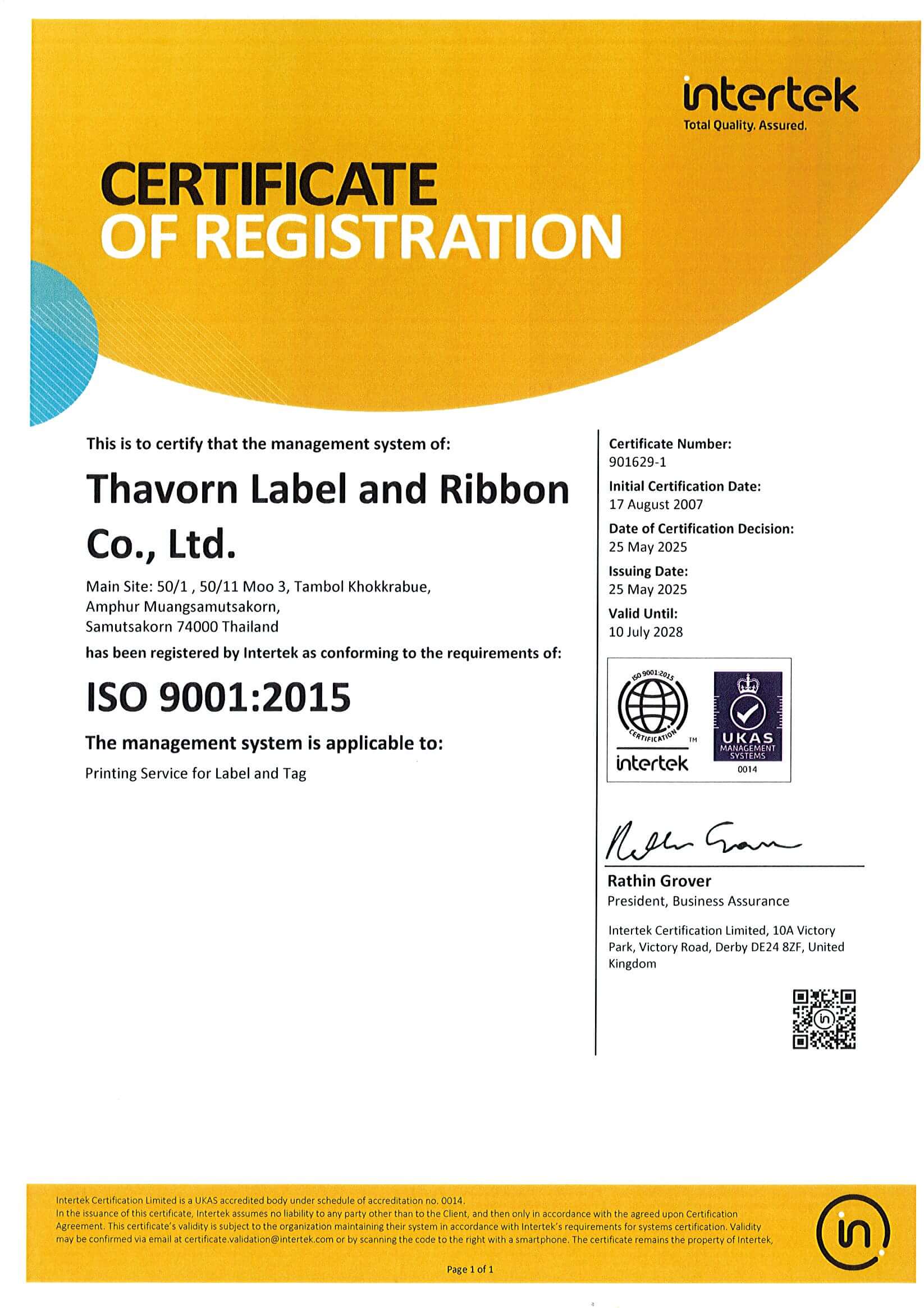 ได้รับการรับรองมาตรฐาน HACCP และ GHP จาก SGS Thailand ตั้งแต่ปี 2009 เพื่อให้มั่นใจว่าฉลากสำหรับกลุ่มอาหาร ยา และสุขอนามัย ปลอดภัย ไร้สิ่งปนเปื้อน - Certified SGS Thailand Co., Ltd. on 24 July 2009